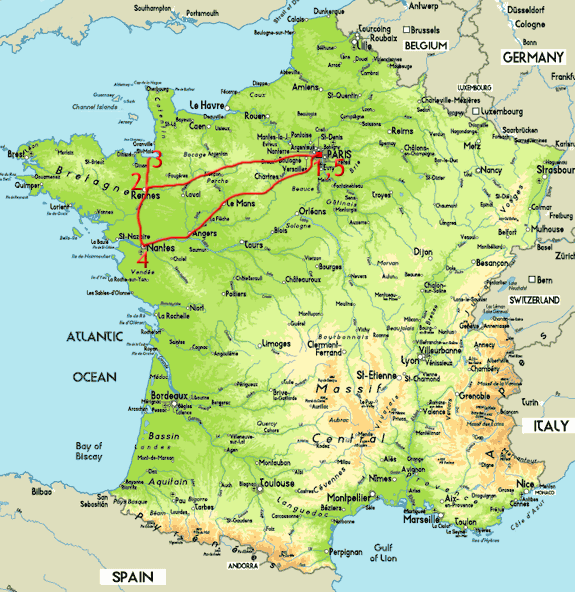 Then we took TGV = (Very Great Speed) Train to Rennes (2). There we met with our new friend Laurent. From Rennes we made a side-trip to Mont Saint Michel (3).