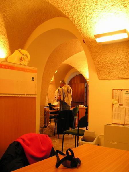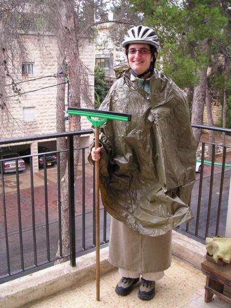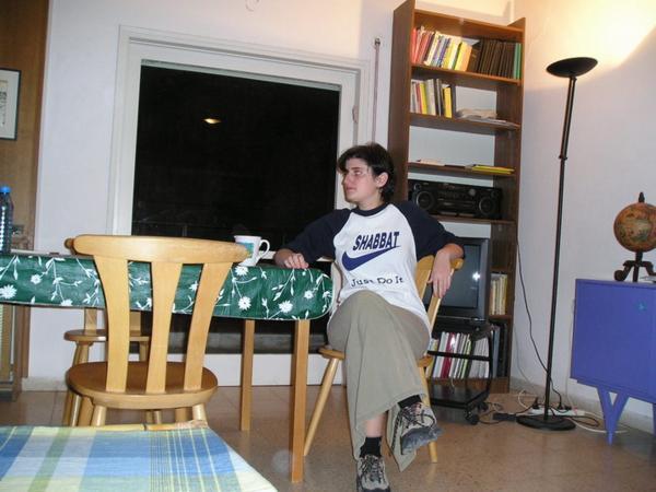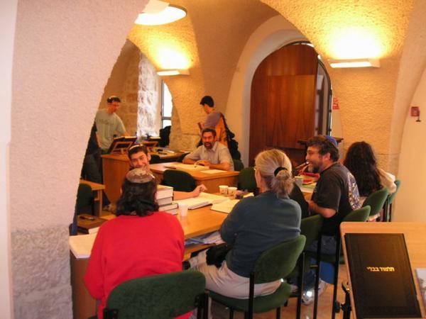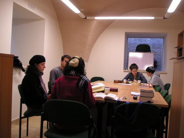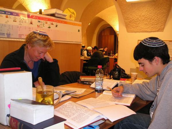 6:15am S velkými obtížemi se probouzím/The pains of waking up6:30am Dobalím z večera připravené věci do školy, beru z lednice připravený oběd/Paking the bag for school (including a lunch which I prepare the day before)6:45am V ideálním případě se navlékám do odrazek a vyrážím ze dveří (většinou je celý ranní proces zpožděný tak o 10-15min)/Ideally, I am putting on all kinds of protective bicycle stuff and I am leaving the house (most of the days, however, all of the first steps are 10-15 min delayed)6:50am Zdravím kočku před dveřmi pana Friedmana/Saying hello to Mr. Friedman´s cat on the 2nd floor6:51am Nasedám na kolo a spurtuji do školy (během období dešťů jsem přestala kolo mýt, je to úplně zbytečné)/Mounting the bike and leaving for school (With the start of the rain season, I stopped cleaning my bike - it is absolutely futile)7:20am Po té, co jsem se převlékla z kraťasů do decentního oblečení a sundala si odrazky, se zarudlým obličejem a stále zrychleným dechem začínám ranní modlitbu šachrit v beit midraši naší ješivy/After changing my shorts for a more decent outfit, I am joining the shachrit in the Yeshiva Beit Midrash, still red in my face, breathing heavily.8:20am Končí šachrit/Shachrit is over8:20am Vyndaváme snídaně a pouštíme se do jídla.../People take out their oats, start to eat their breakfast...8:30am ...a probíráme novinky/...and chat.8:45am- 11am Chavruta hodiny Talmudu (Adiv v plné polní)/ Talmud Chavruta Time (my Talmud chavruta Adiv ready to swim in the Talmud waters)Takhle Adiv předstírá studijní zanícení (v pozadí Sheri)/Adiv pretending studious fervour (Sheri in the background)"Náš stůl" - já s Adivem a Sheri s Arim/ "Our table" Adiv and I, Sheri and AriChavruty jiné Talmudické hodiny/Chavrutot of Ester´s Talmud class11-12:30pm Hodina Talmudu s rebem Mordechaiem/ Talmud shiur with reb Mordechai12:30-1:30pm Oběd (hurá)/Lunch (Yuppee)1:20-3:20pm Odpolední modlitba mincha a pak ulpan nebo, máte-li štěstí, hodina volna (tady jsem na knižním nákupu s Jacobem v Mea Shearim)/Mincha and after that Hebrew/other short class or a free hour (here bookshopping in Mea Shearim with Jacob)3:20-5:00pm Odpolední chavruta (fotky jsem fotila v pondělí, takže máme hodinu "Chumaš s Rašiho komentářem," můj chavruta Dani a Clary, která s námi na skok studuje vždy jednou týdně)/ Afternoon chavruta (this was taken on Monday, which means we are having "Chumash and Rashi class" (My chavruta Dani and Clary who joins us once week for this class)5:00-6:15pm Hodina chumaš a Raši se Shayiou (Rumcajs v pruhované kipě, moje nejoblíbenější hodina)/Chumash and Rashi class with Shayia6:15pm Večerní modlitba maariv/Evening prayer maariv6:30-8:30pm Jak kdy, často jdu třeba na svou permanentku do kina/ The rest of the day depends. Every now and then I use my pass to go to the Jerusalem Cinemateque to see a moviemezi/between 7:30 and 10pm přijedu (hladová) domů/coming home (hungry)Vařím večeři, vařím na další den, omdlívám, usínám/making dinner, cooking for the next day, fainting, falling asleep