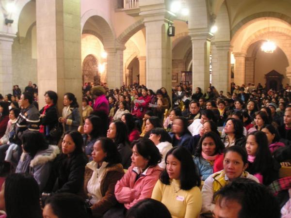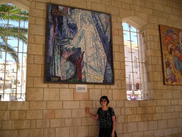 Bazilika Zvěstování zvenku/Basilica of Annunciation from the outsideČeskoslovenská mozaika (hned vedle je ještě samostatná, nezávislá:-) slovenská mozaika.) Velmi zvláštní./Czechoslovak mozaikŘecká/GreekVietnamská a thaiská/Vietnamese and ThaiJaponská/JapaneseKamerunská/CamerunBazilika má krásná mozaikovitá okna, která do kostela vnáší krásně barevné světlo (řada zpovědnic)/The basilica has beautiful mosaic windows which color the incoming light (a row of confessionals)Klepátko na dveřích kostela sv. Josefa/ A knocker on the door of St. Joseph ChurchArabské křesťanské děti na dvoře své školy během přestávky/Christian Arab children on the yard of their school during a breakMuslimští muži odpočívající před mešitou během pátečních modliteb/Muslim men resting on a mosque yard during the Friday prayersŘecko-ortodoxní kostel Sv. Gabriela - podle této církve došlo ke zvěstování tady, asi kilometr od Baziliky zvěstování./ Greek Orthodox St. Gabriel church. According to this christian denomination, the abbunciation took place here, aprox. a kilometr away from the Catholic basilicaMístní muslimský hřbitov/Local Muslim cemetaryVýhled na město z Horniho Nazareta. Všimněte si, jak se okolní vršky po zimních deštích zelenají./A view of the Lower Town from Upper NazarethMůj úplně ze všech nejlepší kamarád Joseph, kterého jsem vyfotila těsně před odjezdem do Nazareta ve škole. Jen abyste viděli, jak vypadá, když už o něm tolik mluvím./ Joseph, my yeshiva buddy