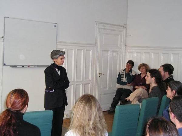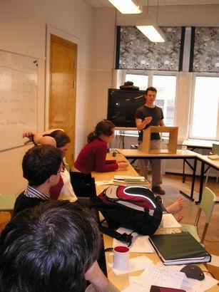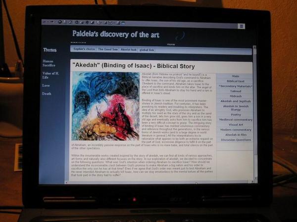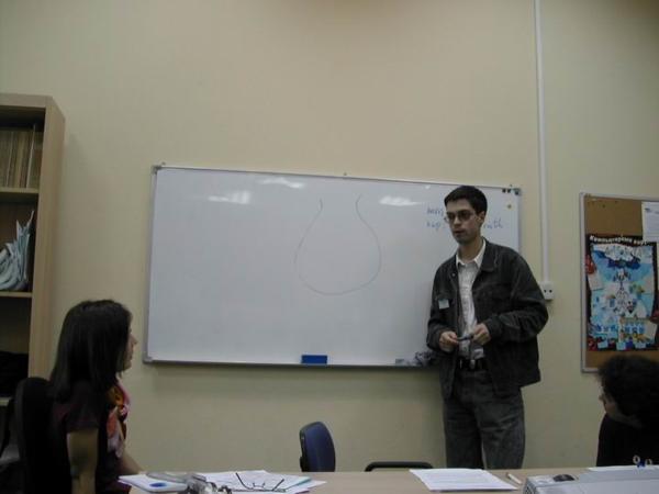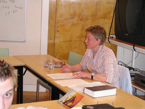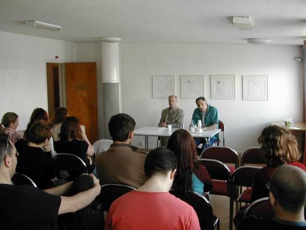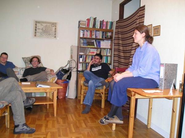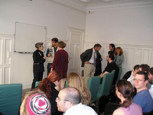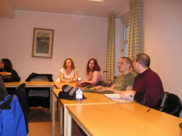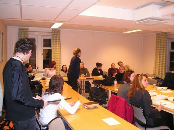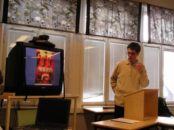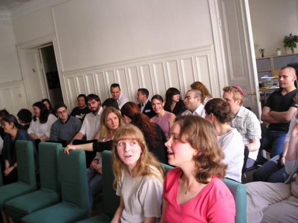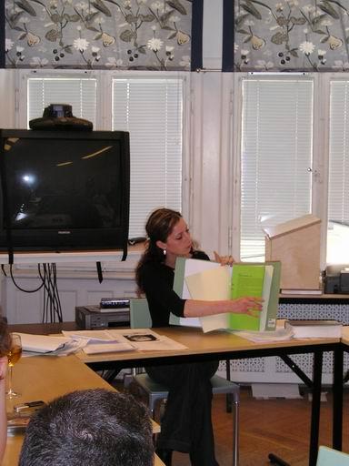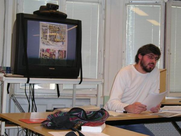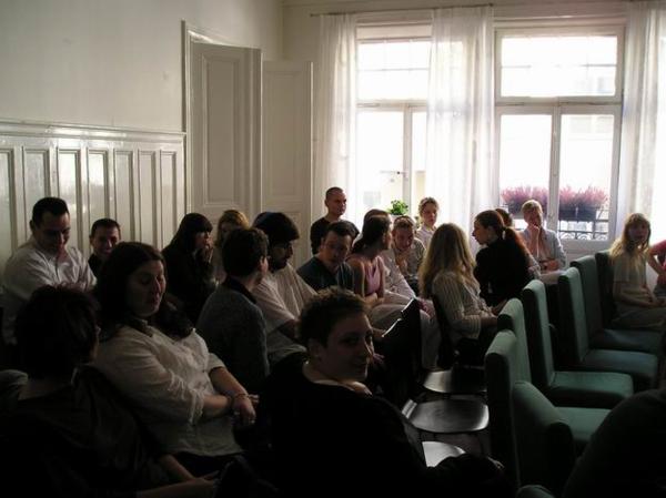 Během letního semestru musí každý ze studentů vypotit závěrečnou práci, kterou na konci studia prezentuje před všemi ostatními. Do tohoto souboru budu během posledního měsíce přidávat nové obrázky tak, jak budou prezentace přibývat./I shall be adding your pictures throughout the month. I appologize to Lena to whose "demonic" presentation I forgot to bring my camera.Clařina prezentace biblického příběhu Celofchatových dcer v jeho klasických a moderních interpretacích./Clary´s presentation of the interpretaion of the biblical story of Zelophehad´s daughtersAviad se snažil vymyslet, jak se dá chevruta použít ve vyučování sekulárních předmětů/Aviad´s choice between chavruta and execution.Torkel začal pracovat na novém románu (určitě jsem už někde zmínila, že je to spisovatel)/Torkel´s remarkable recounting about the sources for his new novelTorkel nás na prezentaci své práce pozval k sobě domů./At Torkel´sTady vypadáme trochu jako Adamsova rodina/The Paideia familyTématem Mikolajovy práce byl Golem/Mikolaj´s research on Golemkterého po jeho prezentaci všichni umíme udělat (dělám si legraci)/With the New York attitude:-)Yael, Natalia a Elina zpracovali ročenku našeho ročníku/The girl´s (our) yearbookKdyž jsme já, Miki a Jeanette prezentovali svůj projekt, neměl kdo fotit, tak vám alespoň ukážu titulní stranu mého příspěvku (více v mém článku)/Our human sacrifice project.Tanya se zkoumala otázku současné židovské identity (Sysifovská práce)/ Tanya´s Jewish identityHenrik připravovil katalog únorového Měsíce umění/Henrik´s Months of the Arts presentationValsovo téma bylo Marc Chagal a Abraham/Vats´s prsentationPetr mluvil o tom, co prožil jeho dědeček za války./The story of Petr´s grandfatherBarna byl úžasný jako obvykle/Barna´s presentation with a very long titleAgata mluvila o vývoji konceptu Paideia vzdělávání od dob starověkého Řecka až po dneěek/Agata´s PaideiaKaždá prezentace byla zaznamenaná na videa (na věčné časy)/Presentations recordingAllan mluvil o cestě své rodiny válečným polskem přes 60. léta do švédské emigrace/ Allan´s presentationSoňa sestavila židovský kanlendář s výtvarnými díly židovských malířů všech zemí původu letošních studentů Paidei a po té mluvila o současné slovenské židovské umělecké scéně/Soňa´s presentation of calendar and contemporary Slovak Jewish artsA jeden pohled do obecenstva/A picture of the listeners
