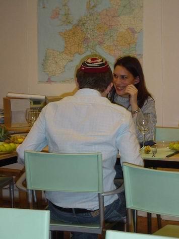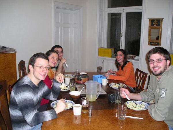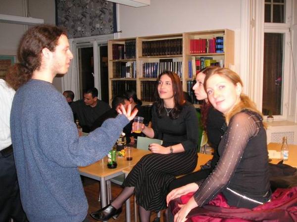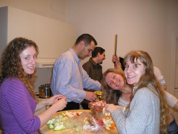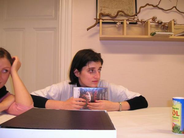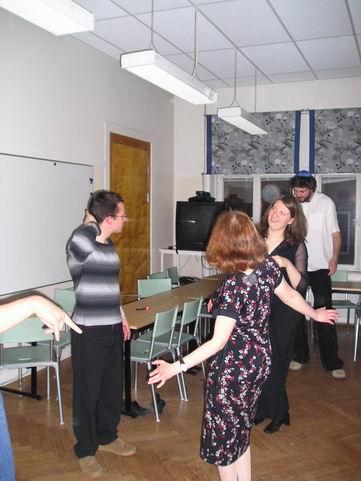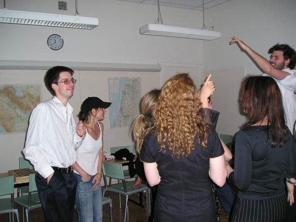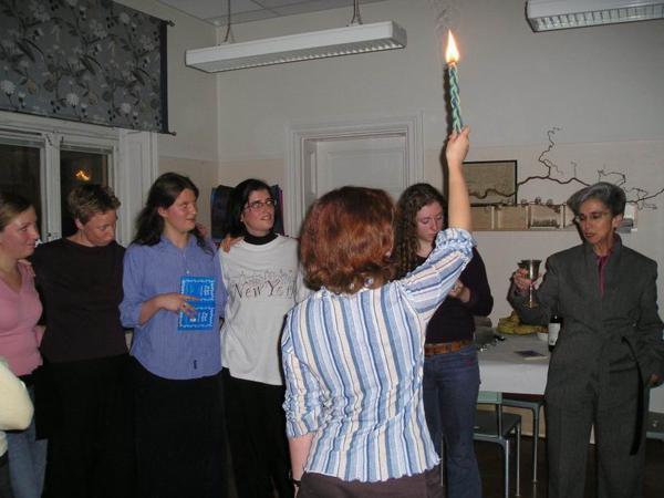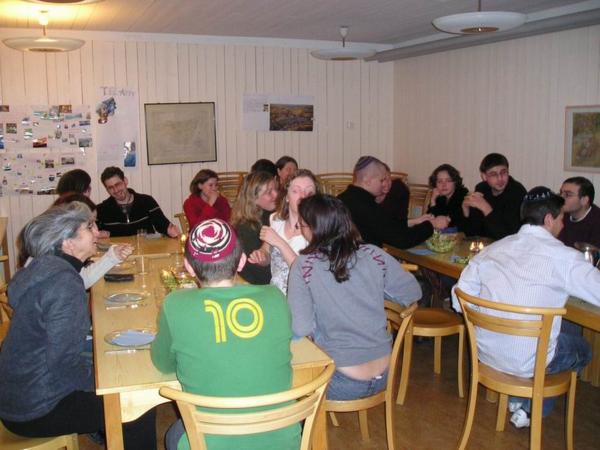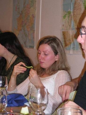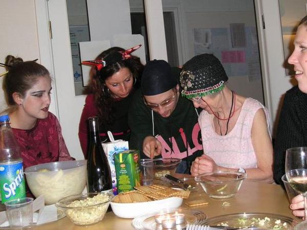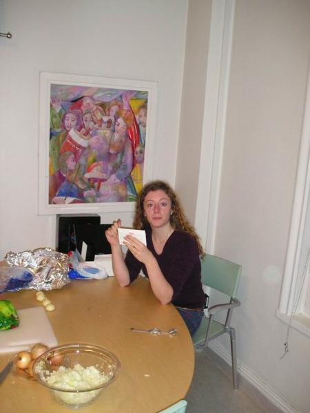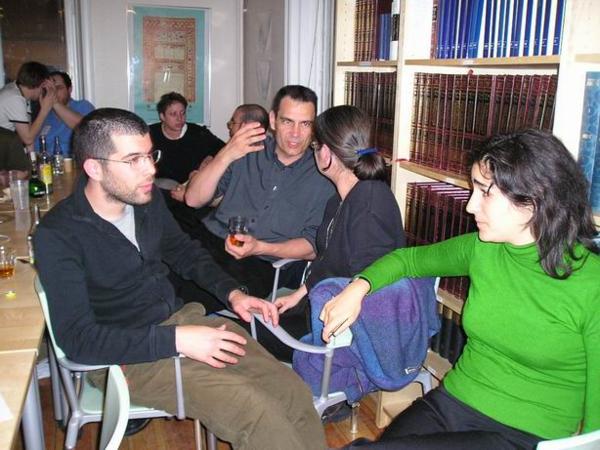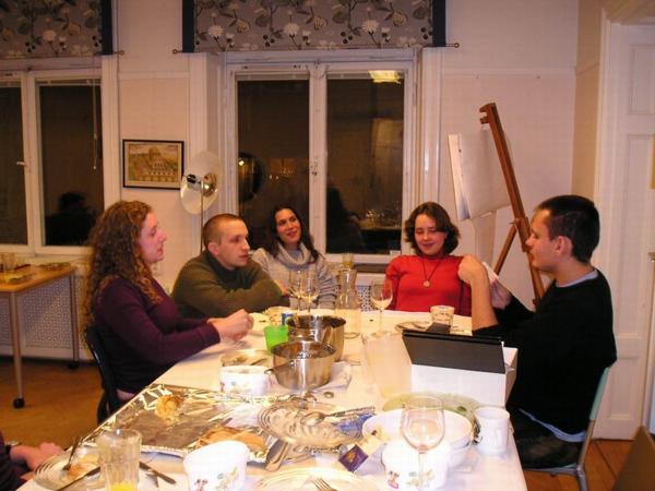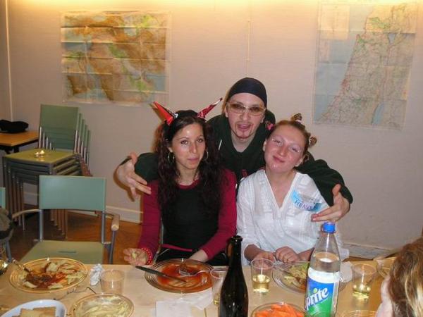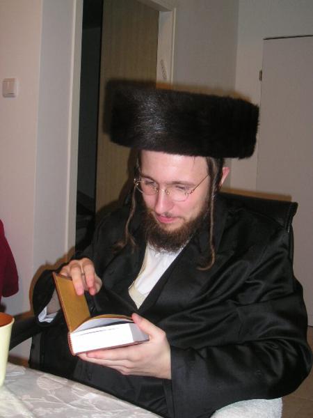 Orázky v této "kapitole" jsou z posledního víkendu našeho zimního semestru.Havdala (drobný obřad, kterým se ukončuje šabat)Lena čte jidiš modlitbu pro dobrý týden "Gott fun Avrohom"Barbara nám mluví do duše:-)Clary a Elina odborně připravují tuňákovou nápň - divili byste se, s čím vším se dají palačinky jíst.Zleva Ester, Elina, Yael a JeanetteTorkel se synem a SašaPři hře "Tradition" (TM), což je něco jako "O poklad Anežky České" se židovskými otázkami. Je to opravdu lahůdka. Chcete-li získat bod, musíte odpovědět na otázky jako: Která biblická postava se oblékala do kozí kůže? Jak dlouhé je pásmo Gaza? nebo Kolik svíček se celkem zapálí během svátku Chanuka? - Hardcore:-)Miki jako "Marek Eben"Yael ve stejné roliLena a Clary při konzumaciTorkl se synemNa konci večírku se na chodbě objevil zvláštní úkazktery se nakonec podarilo vysvetlitOvšem pořád to nebylo nic proti tomu, jaké strašidlo jsem byla já. Poslední dobou jsem neobyčejně zelenkavá v obličeji. Už aby bylo jaro:-)