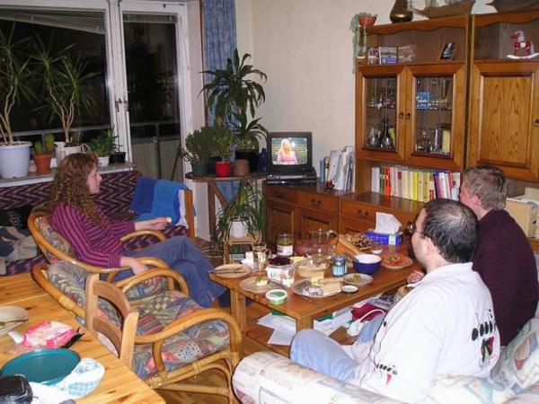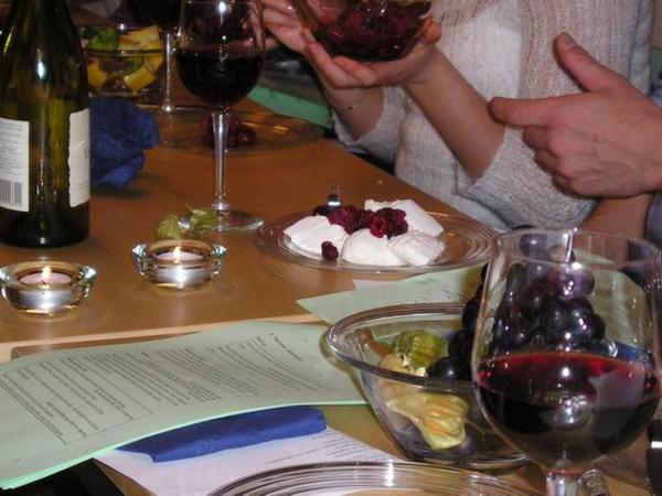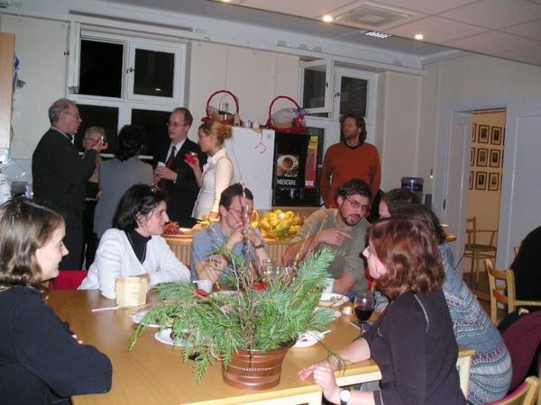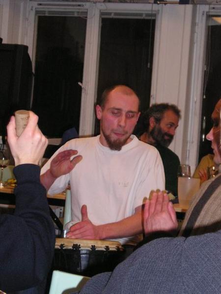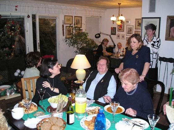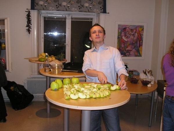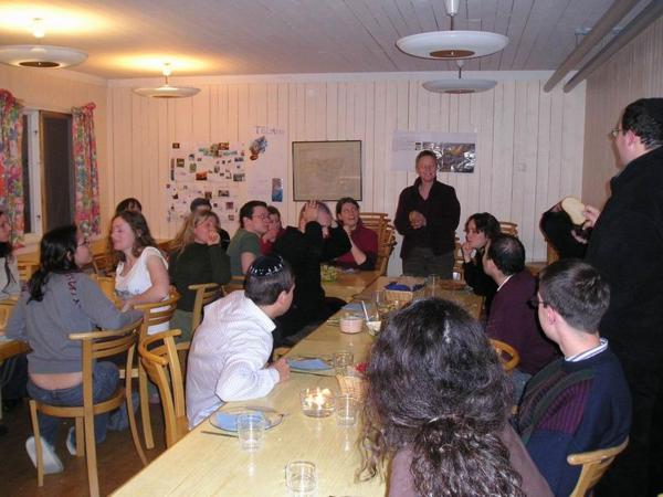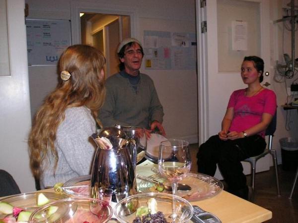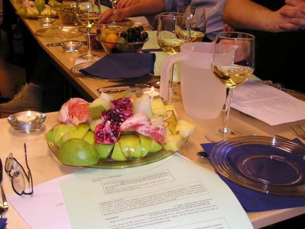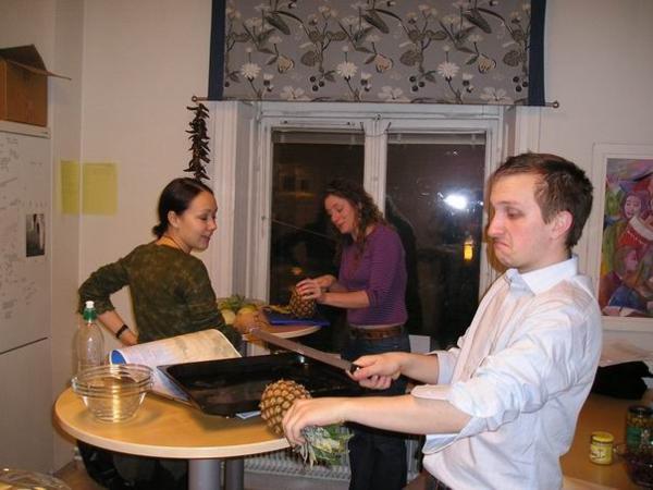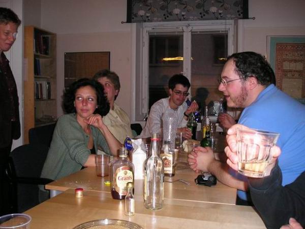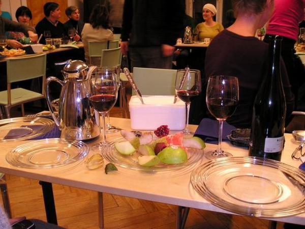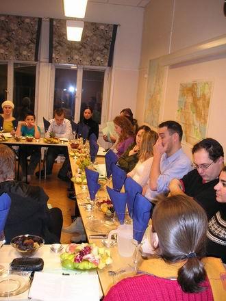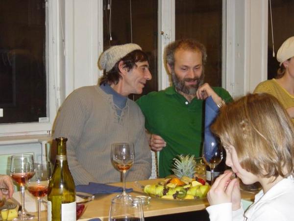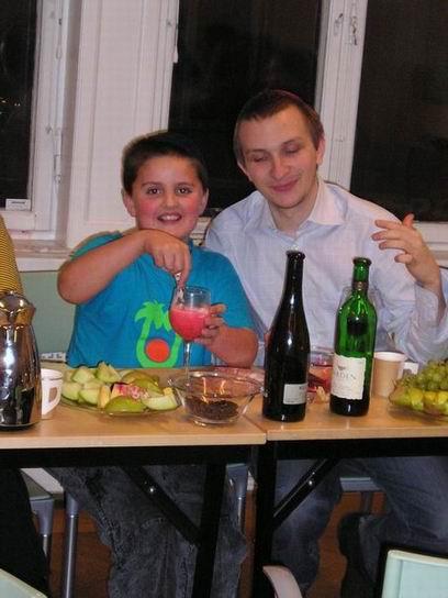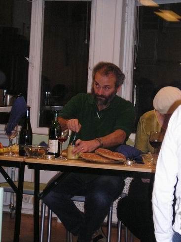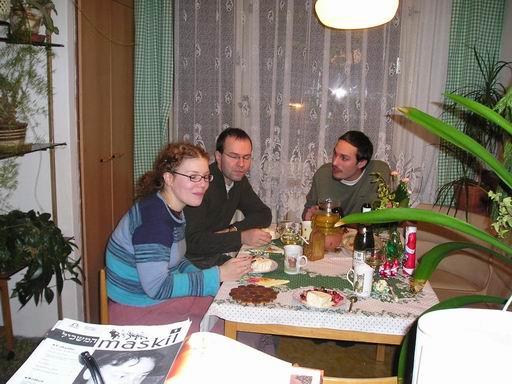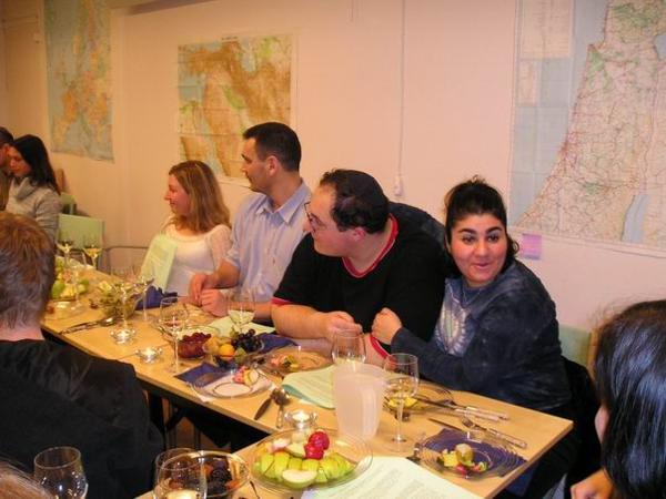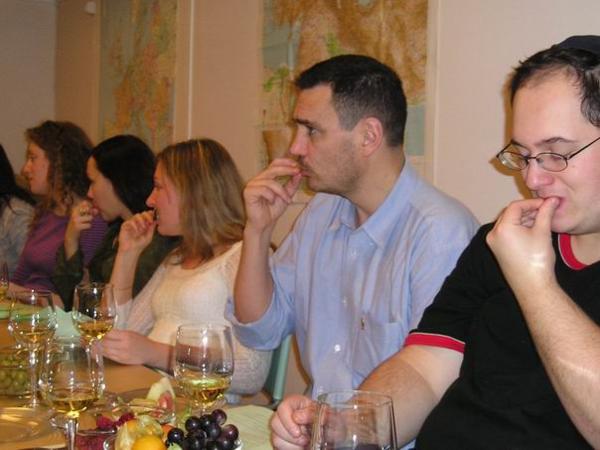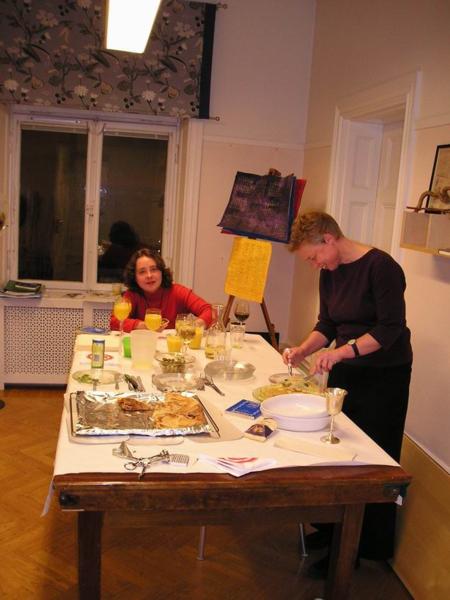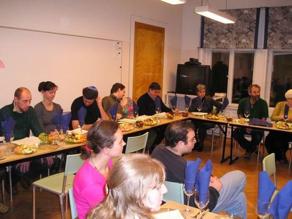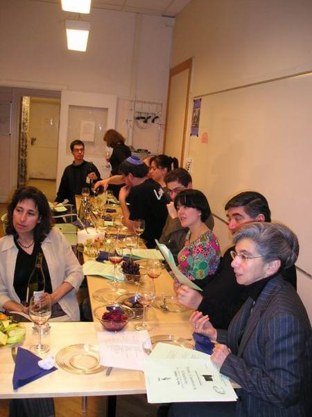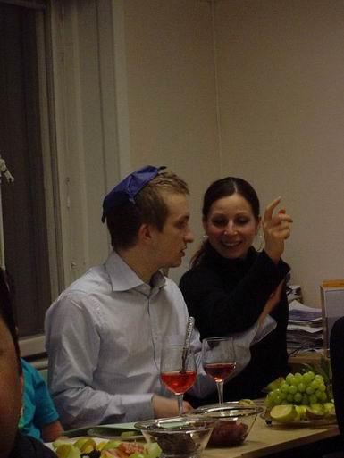 Židovský život mimo Izrael s sebou přináší spoustu paradoxů. Jedním z nich je svátek Tu bi-švat, nový rok stromů, který se slaví podle občanského kalendáře v lednu nebo únoru. V Izraeli začíná v tu dobu všechno kvést. Ve Stockholmu bylo 30 centimetrů sněhu./Tu b´shevat seder in Paideia on 8th February.Svátek se slaví tím, že se sázejí stromy, jí se (mraky) ovoce a - jako u všech ostatních svítků - hodně se jí/Yael launches one of her many lunches (diners)První stateční zahajují boj s metráky ovoce/You never know when you shall need your kibutz experienceMikiho svérázný způsob mytí ovoce/Like here...Uvědomělé rozosminkovávání nesčetných jablek/Whatewer the number of apples you are cutting, retain your dignityPoslední úsměv před popravou/The last happy moment before exectutionNeznámá lepá děva něžně přikrývá chléb ubrouskem/Covering the bread - gently and tenderlyU prostřeného stolu/Shulachan AruchBenji a jeho snoubenka Aliza/Benji and AlizaJedno křídlo stolu/The ones on the leftDruhé křídlo stolu/The ones on the rightBěhem sederu se pijí čtyři poháry vína. První víno je úplně bílé, druhé je bílé s kapkou červeného, třetí červené s kapkou bílého a v poslední skleničce je víno úplně červené./The first cupBěhem večera by každý měl ochutnat alespoň patnáct druhů ovoce (což má často svou střevní dohru záhy po večeři)/Before the first fruitVšichni chroupou/The inedible shell fruitDruhý pohár/The second cupOphir před požehnáním nad chlebem/Ophir before Ha-motziTřetí pohár a stále řídnoucí ovoce/The third cupVillyho svérázné pojetí červeného s bílým/Villy´s peculiar variation on the third cupMoučník s jedním z mnoha druhů ovoce (Švédové v zimě jedí spoustu zmražených bobulí)/"Perfect friut"Barbara se svým mužem/Barbara and PhilMiki a Soňa/Miki and SoňaElina bojuje s avokádem/Elina and her avocado researchMiki a Jannete/Miki and JanneteNa náš seder přišel i Shlomo Bar, zpěvák skupiny Habreira Hativit/ Ophir and Shlomo BarTrochu nám vyprávěl/Now listen to what I have to say...a trochu zpíval a bubnoval/and to singAle naši kluci taky moc pěkně bubnují/Art in motionAndrij, Valtsův Kamarád z Rigy/Andrij drummingA nakonec zbyla velká spousta pecek a šlupek a spousta nakrájených vitamínů, které jsme dojídali ještě tři další dny/The remnants