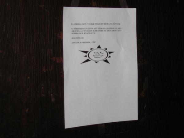 Již jednou jsem se zmínila o tom, že Švédsko je velmi egalitariánskou zemí. Kromě jiného, švédští muži si mnohem častěji než jinde ve světě berou mateřskou dovolenou, dělí se se svými ženami o domácí práce a starají se různé méně populární věci, které s sebou přináší rodičovství. Počítá se s tím i na veřejných toaletáchPokud máte alergii na psy, je pro vás v metru vyhrazen speciální prostor, do kterého nic chlupatého nesmí.Zálivy a průlivy ve stockholmském souostroví jsou většinou velmi úzké, zato většinou velmi hluboké. Proto jimi běžně proplouvají obrovské zaoceánské lodě s hlubokým ponorem.Často je to velmi bizardní pohled. Povšiměte si zejména nepoměru mezi velikostí tohoto trajektu a domečků na pobřeží.Švédové nemají příliž vytříbený smysl pro humor, ale sem tam se jim podaří něco roztomiléhoJako třeba tady.Pokud ve Švédsku bydlíte v činžáku, většinou si nemusíte kupovat pračku. Skoro všichni perou ve společných prádelnách, které jsou v přízemí každého domu.Ještě jsem neviděla, aby ve Švédsku někdo sušil prádlo na zahradě nebo na balkóně. Všechno se dává do sušičky nebo do těchto elektrických sušících skříní. Pověsíte do nich prádlo, zavřete, otočíte knoflíkem a za 3 hodiny je prádlo suché - no nic moc ekologického.Téměř každé vchodové dveře se otevírají číselným kódem. Když vás někdo pozve na návštěvu, nezapomeňte se ho na kód zeptat. Jen málokterý dům má domovní zvonek.Švédové mají rádi ticho a klid. Když si pozvete v činžáku někoho na večírek, musíte s dostatečným předstihem v domě vyvěsit upozornění, že se z vašeho bytu bude v danou dobu ozývat hluk.Švédové někdy až protivně milují pořádek. Když jsme odjížděli z víkendu v Glämstě, dostali jsme tento seznam prací, které jsme měli při úklidu vykonat. Seznam obsahuje i pokyny typu: "Při vytírání často měňte vodu", "Z toalet odstraňte prázdné trubičky od toaletního papíru" nebo "Nezapomeňte zamést také pod postelemi."