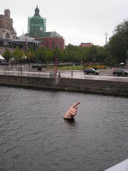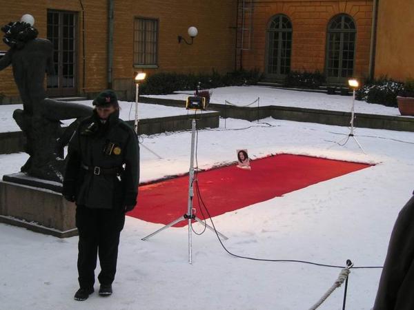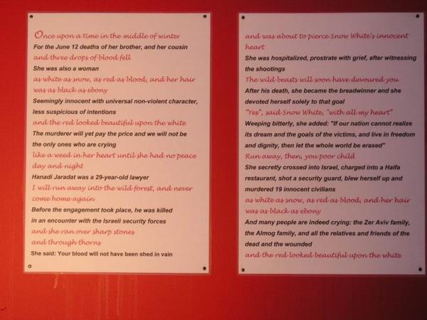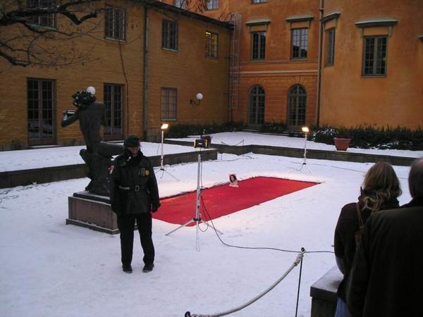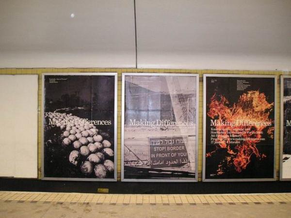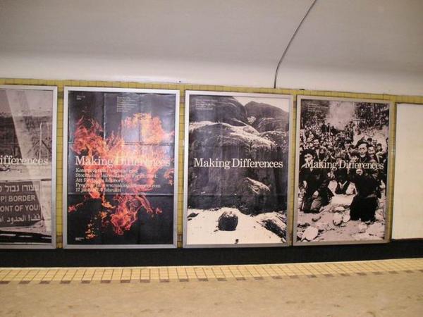 "Snow White and Madness of Truth - Sněhurka a šílenství pravdy." Autorem je Dror Feiler, který se narodil v Izraeli (v židovské rodině) a který již 20 (?) let žije se svou švédskou ženou ve Švédsku. "Sněhurka" sestává z bazénku naplněného krvavě červenou tekutinou, na jejíž hladině plave bílá umělohmotná loďka s obrázkem Hanadi Jaradat, 29-leté sebevražedné atentátnice, která se 4. října 2003 vyhodila do vzduchu v haifské restauraci Maxim a zabila tak sebe a dalších 21 Izraelců. V pozadí instalace hraje nepříjemě teskné Bachovo "Mé srdce pluje v krvi." Tento obrázek jsem vyfotila v neděli 25.1., kdy instalaci již hlídali švédští policistéInstalace je umísěná na dvoře Historiska Museet ve Stockholmu jako součást projektu "Making Differences." Tento projekt, jehož součástí je několik výstav, filmů, panelových diskusí atd. doprovází mezinárodní konferenci "Preventing Genocide" (Jak zabránit genocidě), která se ve Stockholmu koná 26-28.1. Konference se zúčastní představitelé 70 zemí, zahájí ji Kofi Annan a předsedat jí bude švédský premiér Göran Persson. (Mimochodem-pro Švédsko je konference událostí nejvyššího významu. Pokud jsem si satčila všimnout, česká média (alespoň ta internetová) jí takřka vůbec nevěnují pozornost. Hm, zajímavé.Text doprovázející instalaci.Upoutávka na projekt "Making differences" ve Stockholmském metru 1Upoutávka na projekt "Making differences" ve Stockholmském metru 2