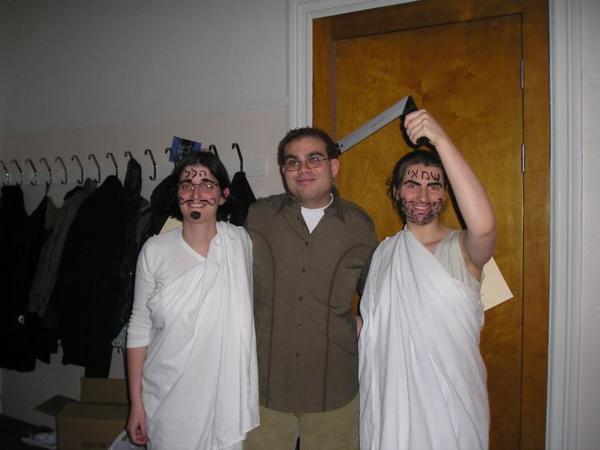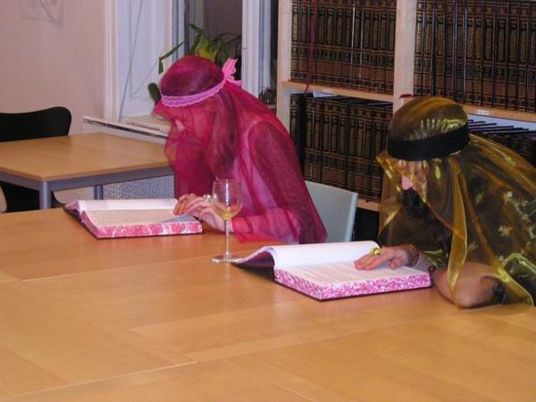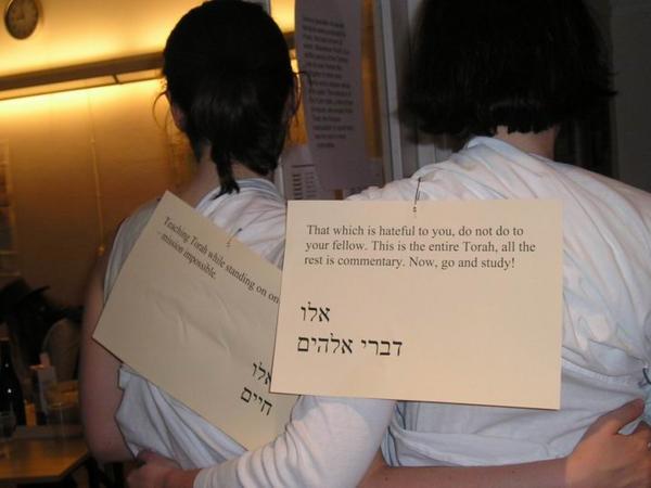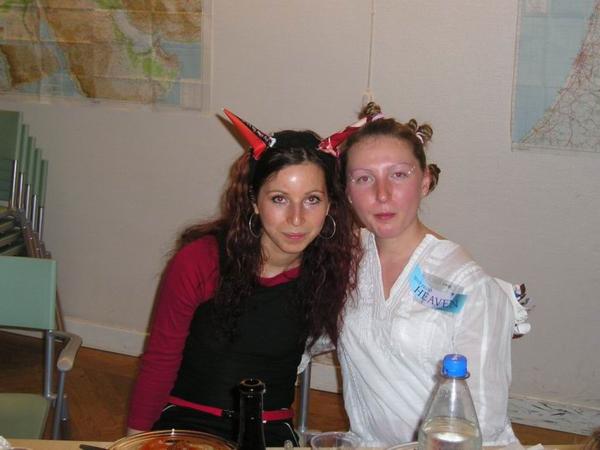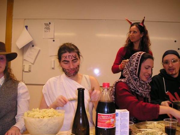 Přichází jaro a s ním další nával židovských svátků. Minulý víkend byl purim. Toto je naše společná příprava s Agatou (ja snad ještě jednou budu opravdová hospodyňka:-)V neděli večer jsme měli v Paidei purimový večírek v maskách. Já a Agata jsme šli za Hilela a ŠamajeZáda naší maskyS andělem ElinouS Aviadem, který si pro tuto příležitost nechal odbarvit své izraelsky černočerné vlasy, a tím úspěšně zaútočil na post "největší trouba večera"Elina se svým protějškem ďáblem Soňou a s Mikim, který šel za AliG, izraelsko-britského televizního bavičeElina se SoňouSoňaa ještě jednou SoňaSoňa a MikiTanya, která šla za tajemnou ženuPetr šel za Petra a Lena šla za EsterJeanette byla za pákistánskou ženuYael za chlapaOphirova žena Sara za gejšuJejí syn za Robina HoodaValts šel za sionistu a přivedl s sebou dvě orientální ženy,které se později odstěhovaly do Bejt midraše a za zvuků technohudby linoucí se z vedlejší místnosti začali pro mě z nepochopitelných důvodů studovat TalmudTorkel oprášil svou starou uniformu a šel za pilota SASOphir šel myslím za Mlčení jehňátekA jak už to na purimových večírcích chodí, lidé dělali humor,pili,a ještě pili,a jedlia zase dělali humora hráli hrya pumprlíkovalia žvatlalia tak.
