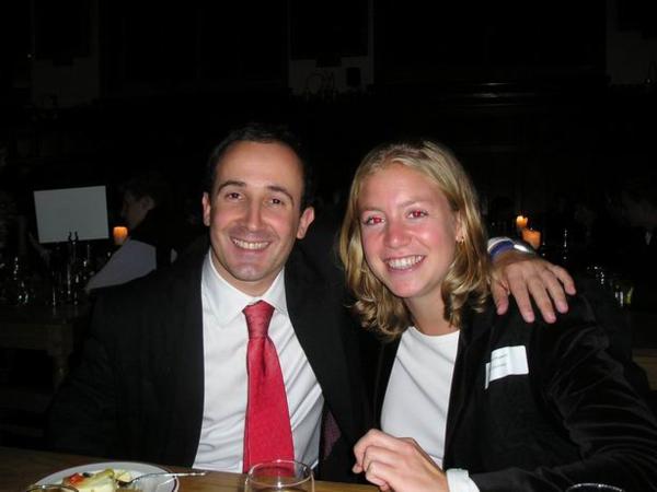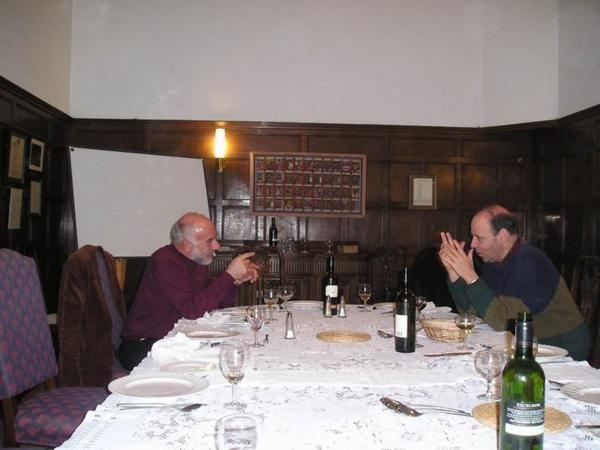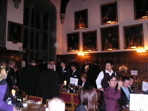 Slavnostní večeře v talárech uvnitř/A ceremonial dinner in gawns in the hallTen kluk ve vínové košili je můj zmiňovaný kamarád Omar z Bahrajnu/The man in the lila shirt is