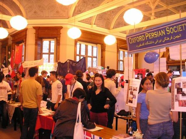 společenského života oxfordských studentů./Students´ fair where the Oxford societies try to atract