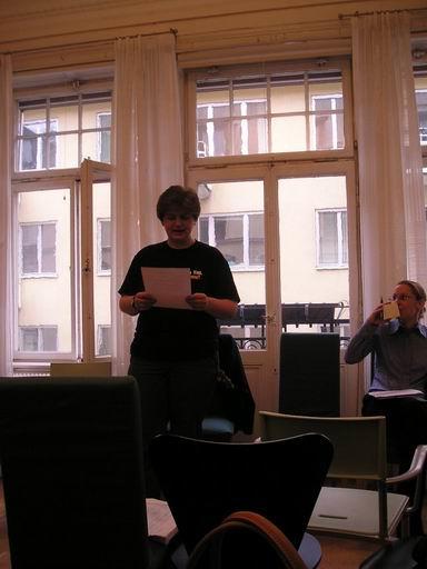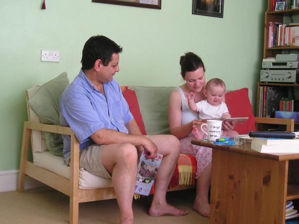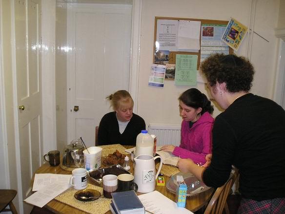 the one holding a tea cupLena ponořená do novin/Lena reading the papers during a breakA ještě jednou přestávka./And a tea break again.Holky cvičej jógu/My brave flatmates practicing YogaNávštěva Majiných rodičů (tatínek nalevo) a Lenina kamaráda Skota/Maya´s parents visit (her