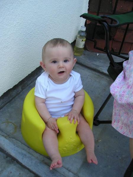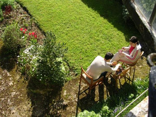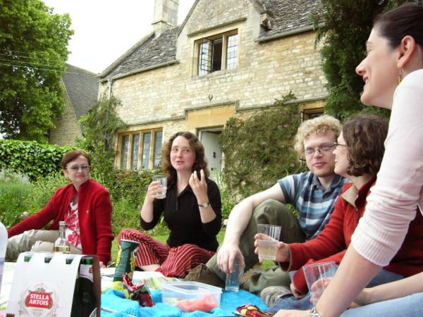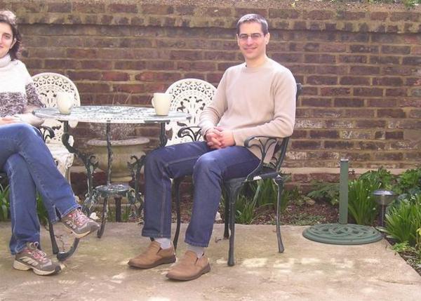 lower right-hand corner)Uvítací britský šálek čaje u Roye na zahradě. Fotili jsme to samospouští - já jsem useklá, ale